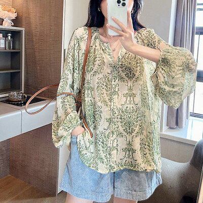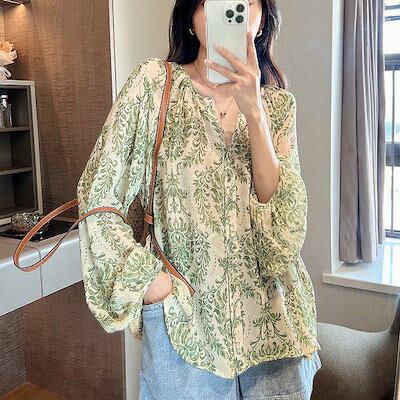 ブラウス 長袖 レディース シフォンブラウス トップス アラベスク模様 アラベスク柄 柄シャツ 総柄 シフォン キーネック 春 薄手 ボリューム袖 おしゃれ かわいい 大人可愛い リゾート 夏 ルーズ