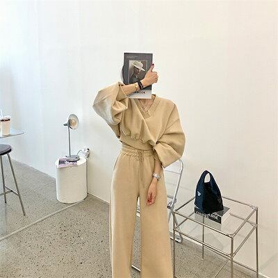 スウェットセットアップ レディース 秋 冬 長袖 キレイめ 上下セット 裏起毛 スウェットパンツ 2点セット Vネック 暖か 着やせ 大人 カジュアル ボトムス トレーナー ショートトップス ロングパ