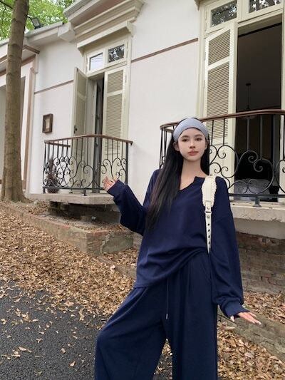 2024 秋冬 韓国 かわいい レディース 無地 Vネック長袖トップスレトロセットアップ_白パーカーブルサイズ丈春カジュアルスポーツファッション系通学学生袖お出かけアップシルエットトラック