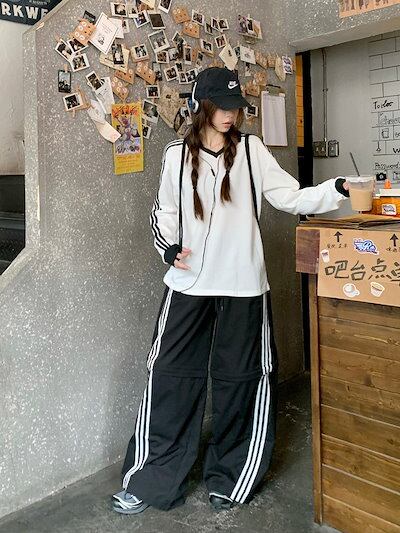 2024 秋冬 韓国 かわいい レディース 無地 Vネック長袖トップスレトロセットアップ_白パーカー上下サイズ丈春カジュアルスポーツファッション系通学学生袖お出かけアップサイドシルエットトラック羽織り