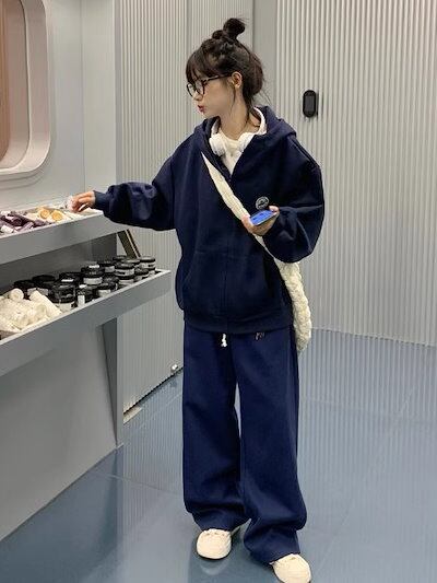 2024 秋冬 韓国 かわいい レディース 無地 フード付き長袖アウターレトロセット_白フーディーブルサイズ丈トップス春カジュアルスポーツファッション系通学学生袖お出かけアップシルエットトラック