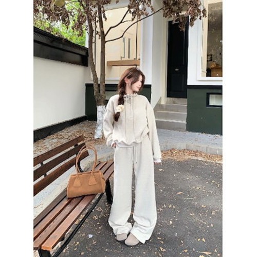 2024 秋冬 韓国 かわいい レディース 厚手裹起毛無地 長袖アウターレトロセット_白上下ハーフサイズ丈トップス春カジュアルスポーツファッション系通学学生袖お出かけアップシルエットトラック羽織