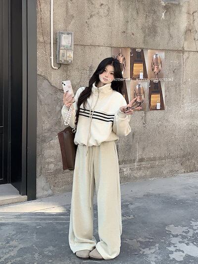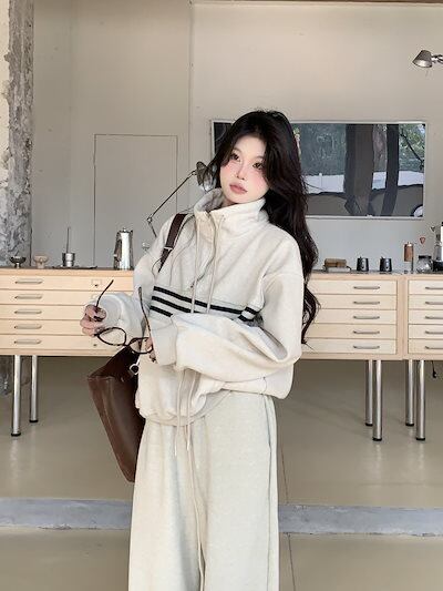 2024 秋冬 韓国 かわいい レディース厚手 裹起毛無地ハイネック長袖アウターレトロセット_白フーディーハーフサイズ丈トップス春カジュアルスポーツファッション系通学学生袖お出かけアップシルエット