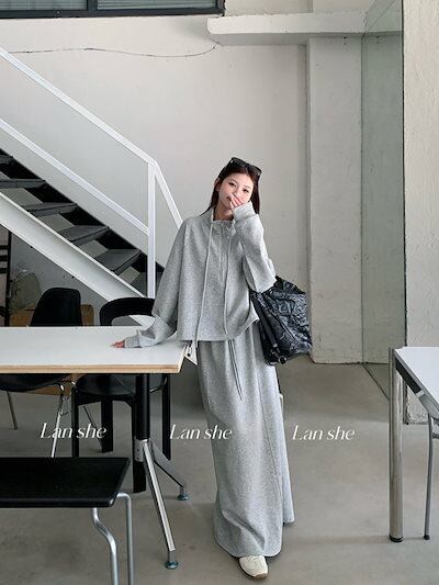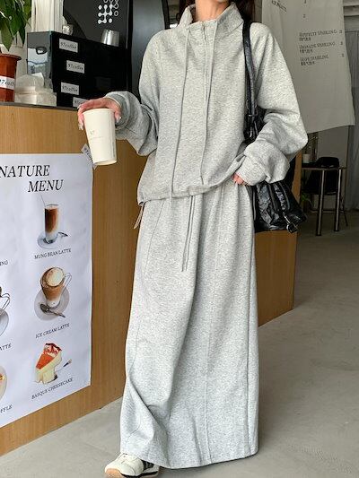 2024 秋冬 韓国 かわいい レディース無地ハイネック長袖アウターレトロセット_白フーディーハーフサイズ丈トップス春カジュアルスポーツファッション系通学学生袖お出かけアップシルエットトラックロング