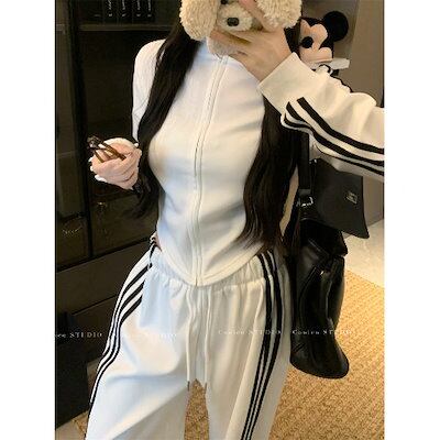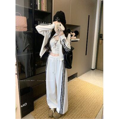 2024 秋冬 韓国 かわいい レディース無地フード付き長袖アウターレトロセット_白フーディーブルサイズ丈トップス春カジュアルスポーツファッション系通学学生袖お出かけアップシルエットトラック羽織り上下
