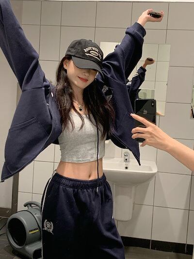2024 秋冬 韓国 かわいいレディー 無地 フード付き長袖アウターレトロセット_白フーディーブルサイズ丈トップス春カジュアルスポーツファッション系通学学生袖お出かけアップシルエットトラック上下羽織り