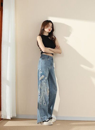 ワイド脚ハイウエストジーンズ夏の新作鳳凰刺繍ストレートゆったりトレンド着痩せフレア垂