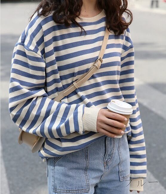 全2色 スウェット トレーナー 切り替え バイカラー 体型カバー 着痩せ ボーダー柄 シンプル カジュアル