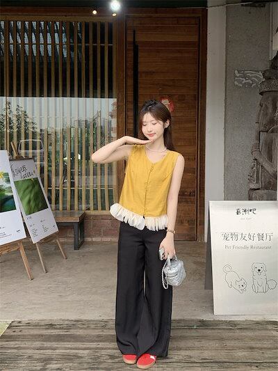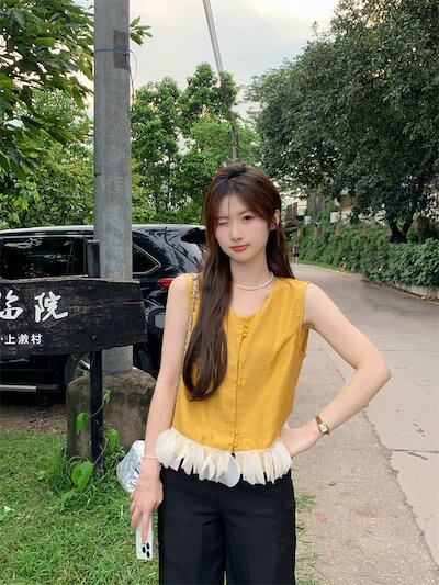 2024 春夏トップス シャツ ノースリーブ ボタン ラウンドネック フリル ゆったり 細見え 夏 黄色 イエロー おしゃれ かわいい 韓国ファッション レディース お出かけ