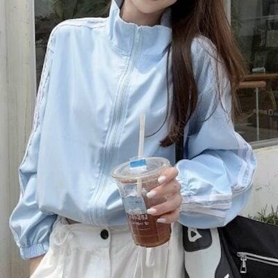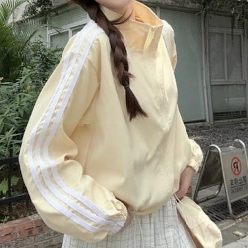 2024春夏アウター カーディガン ジャケット 襟 スタンドカラー ジップ チャック ストライプ ゆったり 細見え 夏 水色 黄色 白 黒 かわいい ガーリー キュート おしゃれ 韓国ファッション レ