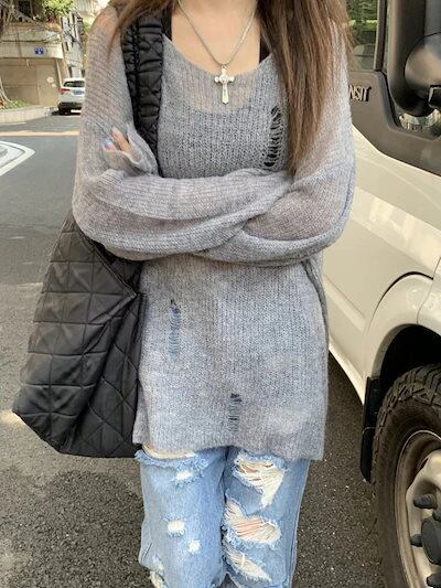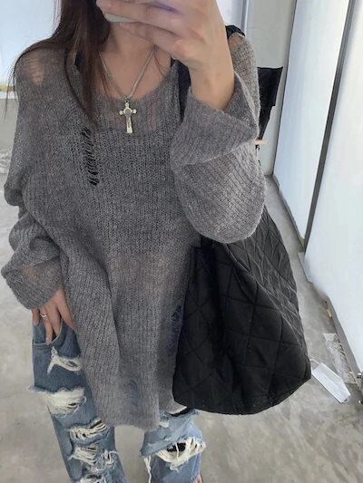 2024春夏 長袖 ニット プルトップスストリートカジュアエコルシルエットクルーネック加工色っぽ 女っぽ カジュアル 大人っぽ 上品 サイズフェミニンゆったりカジュアル レディースゆったり秋冬春