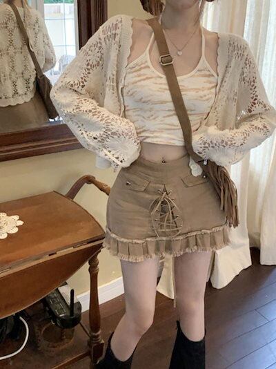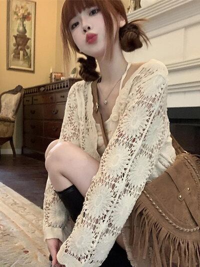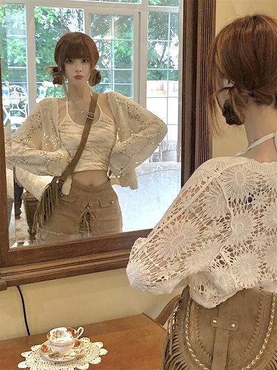 2024 夏 韓国 ショート丈 薄手 カーディガン トップス 長袖 紫外線対策 UVカット冷房羽織り加工 きれいめ ライトニット オフィス OLネックカジュアルフレンチフェミニンファッション韓国レディ