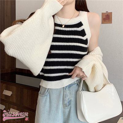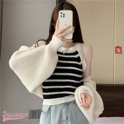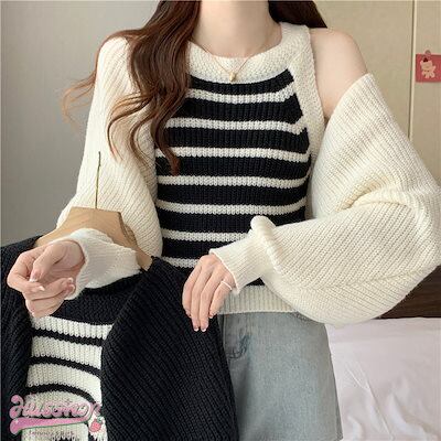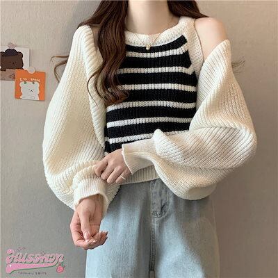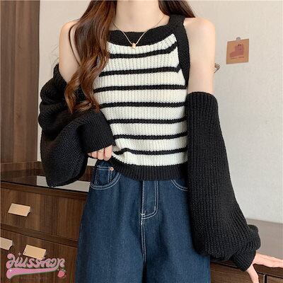 韓国抜け感が可愛い 2枚 トップス ニット セーター レディース 長袖 ゆったり かわいい カジュアル きれいめ スリーブ 夏 羽織り ファッションきれいめ 大人っぽ ショートタンクトップカジュアル秋