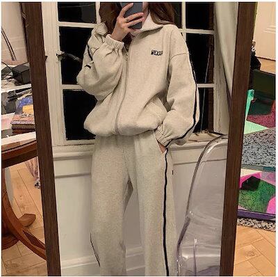 2024 春秋 2点セット トップス お出かけ 羽織り ショート丈 セットアップ フルラウンドヘム ルーズ サイド ボトムス ストレート系冬 ゆったり サイズワイドシルエット リラックストラック