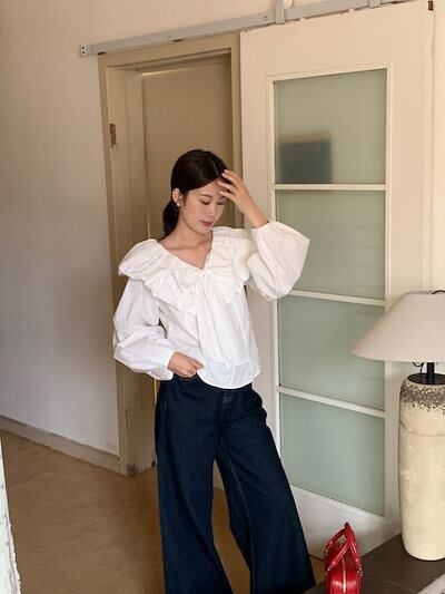 2024秋冬トップス シャツ リボン Vネック フリル 長袖 ゆったり 秋 白 ホワイト おしゃれ かわいい ガーリー キュート 甘め キレイめ 韓国ファッション レディース お出かけ