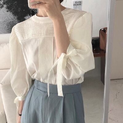 2024秋冬トップス シャツ リボン ラウンドネック プリーツ 長袖 ゆったり 秋 白 茶色 おしゃれ かわいい ガーリー キュート 甘め 韓国ファッション レディース お出かけ