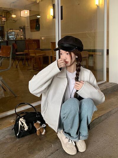 2024 秋冬アウター ジャケット ショートコート リバーシブル ストライプ 長袖 ジップ チャック 襟 秋 白 黒 おしゃれ かわいい 韓国ファッション レディース お出かけ