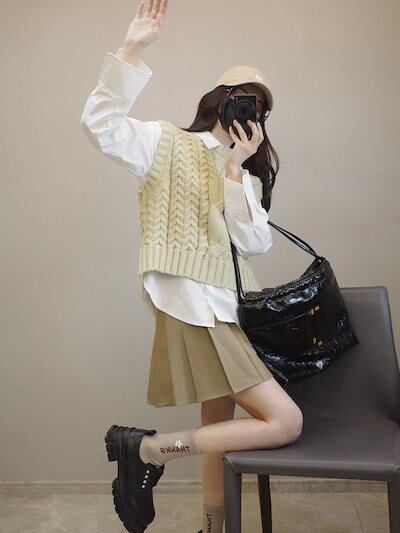 冬アウター 涼しく楽ちんセットアップスリーピーススーツ/ワンピース春秋韓国風カレッジ風ニットベスト重ねベストシャツ+プリーツスカート付きレディース通勤