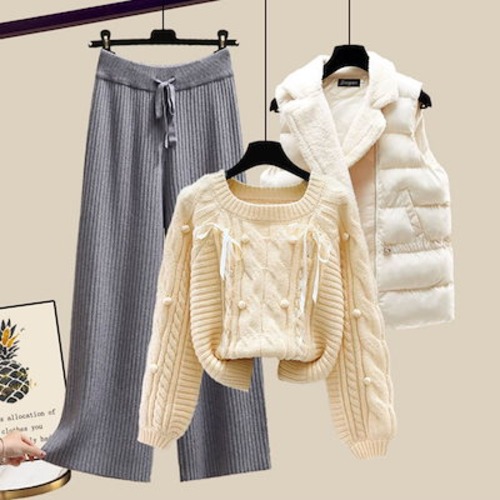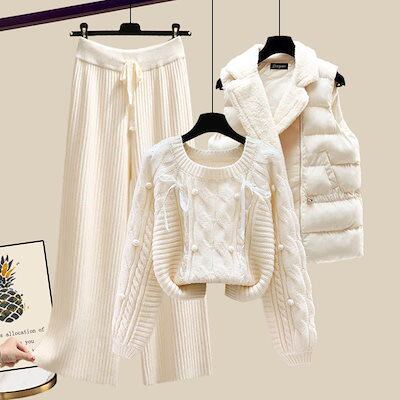 小柄な人 冬服 3点セット ベスト+セーター+ワイドパンツ スーツ 厚手 カジュアル レディース セットアップ