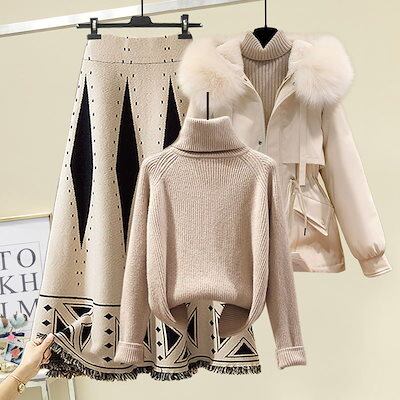 冬新作 2点セット/3点セット レディースファッション 中綿コート/ タートルネックセーター/ニットスカート セットアップ