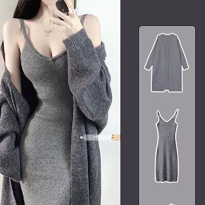 レディー2点セット セクシー セーターコート+キャミソールワンピース 着痩せ 秋冬 体型カバーニット