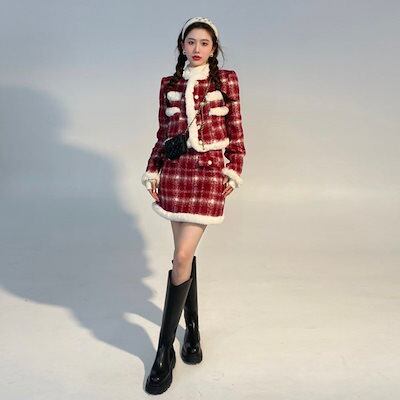 クリスマスセットアップ レディース 長袖 チェックコート+ショートスカート/ロングスカート 冬服 上下2点セット