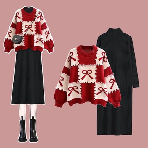 秋冬 レディース セットアップ 新しい レッド ゆったり セーター+ ニットワンピース カジュアル 2点セット