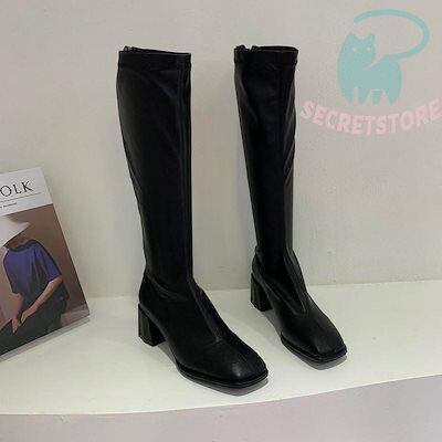 ロングブーツ レディース ロング丈 太ヒール スクエアトゥ トレンド PU シンプル 美脚 おしゃれ 歩きやすい 履きやすい ファスナー付き