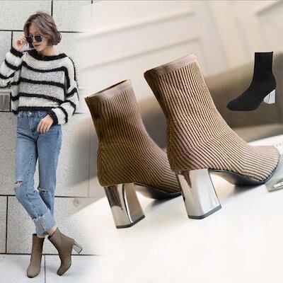 【3日以内出荷】ショートブーツ ストレッチ レディース ニット ソックスブーツ スクエアトゥ チャンキーヒール 太ヒ